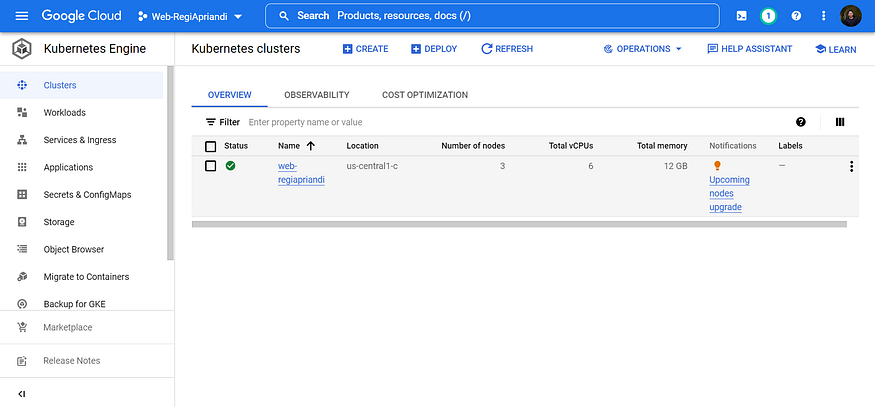 Wait a few minutes for the google cloud platform to build the Kubernetes cluster, then after the cluster is completed, open the activated cloud shell as shown in the following image, to be able to access and run Kubernetes, we can do this here. check the nodes on the terminal to make sure the nodes are running properly.