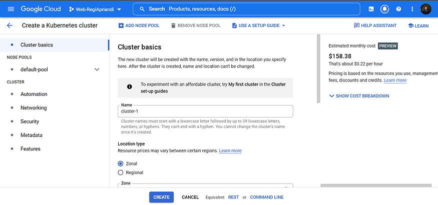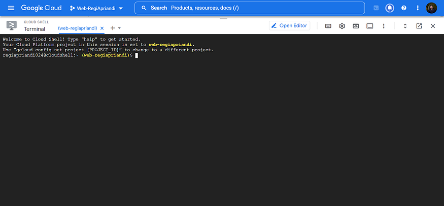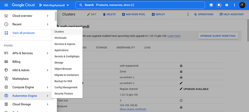 Wait a few minutes for the google cloud platform to build the Kubernetes cluster, then after the cluster is completed, open the activated cloud shell as shown in the following image, to be able to access and run Kubernetes, we can do this here. check the nodes on the terminal to make sure the nodes are running properly.