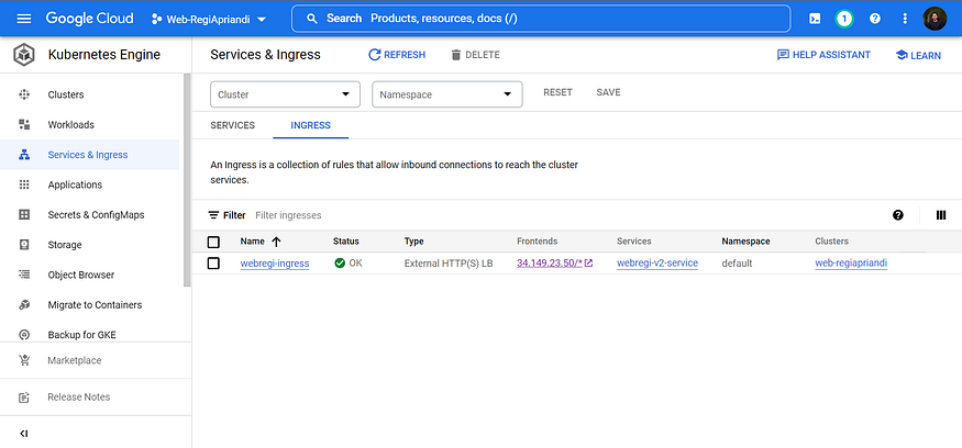 After the configuration is applied to Kubernetes, we can see the application service on the Service & Ingress menu on the Google Cloud Platform page.